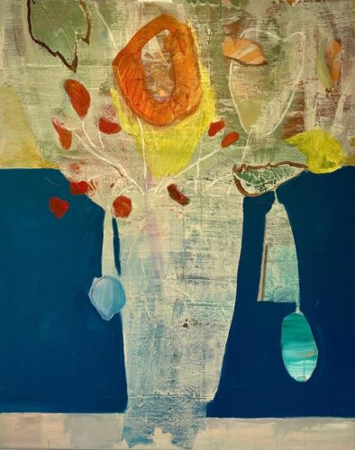 De heen en weer gaande beweging tussen vol en leeg chaos en structuur openheid en verdichting is een voor haar natuurlijk proces waarin zij al schilderend meegaat. Zelf zegt ze over haar werk “ik ben serieus aan het spelen”. Leuk als je komt kijken.