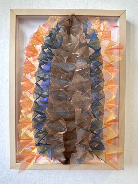 Haar abstracte sculpturen, gemaakt van glanzend, kleurrijk en transparant organza, vangen het licht op een verrassende manier en veranderen voortdurend van uitstraling – afhankelijk van waar je staat, hoe je kijkt, en hoe het licht valt.